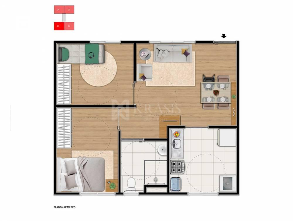 02 quartos, sala, cozinha, banheiro, 01 vaga de garagem (descoberta)